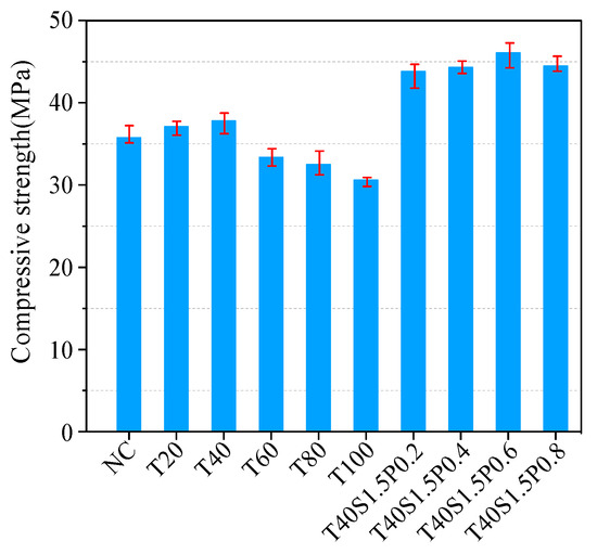 According to the Chinese standard GB/T50080-2002 [46], concrete workability is assessed by analyzing slump, as indicated in Figure 6. Slump exhibits a linear decline with increasing IOT content, particularly pronounced in T100, which experiences a 63.41% decrease compared to NC. Comparable trends have been documented in the literature [11], attributed to the larger surface area, coarser particles, finer grain size, and greater water absorption of IOTs in comparison to RS [12]. Additionally, the addition of SF and PF to concrete reduces the slump. For instance, compared to NC, slump values decreased by 39.02%, 43.9%, 52.84%, and 60.16%, respectively. This reduction is primarily attributed to fiber adhesion, tension, and water absorption [47]. Furthermore, fibers dispersed in IOT concrete easily form a network structure, impeding concrete flow [48]. From the aforementioned analysis, it can be inferred that the inclusion of IOTs or fibers in concrete results in a reduction in slump.