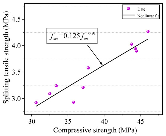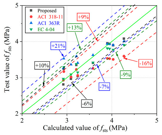 Equation (1) describes the association between fcu and fsts, which is well established. Parameters a and b vary across different versions and are proposed based on numerous Chinese and foreign national standards and studies, including ACI318-11 (a = 0.5, b = 0.5), ACI363R (a = 0.52, b = 0.5), and EC4-04 (a = 0.3, b = 0.67) [60,61]. Parameters a and b are determined through the fitting, resulting in a = 0.125 and b = 0.91, as illustrated in Figure 6 and described by Equation (2). Finally, this paper compares the test results with the calculation results of national standards, as depicted in Figure 9.