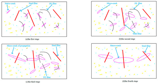 The crack propagation model of fiber-restrained concrete is depicted in Figure 11. SF, characterized by high elastic modulus, and PF, characterized by low elastic modulus, are randomly dispersed in the matrix to impede crack propagation at various scales, thereby significantly enhancing concrete ductility. Initially, under low matrix loads, PF limits primary crack development, as illustrated in Figure 11a. As the load increases, primary cracks evolve into micro-cracks within the matrix, and the PF’s bridging effect inhibits crack progression, as depicted in Figure 11b. Subsequently, as the load intensifies and micro-cracks propagate, PF bridges may disengage or fracture, transferring the load to adjacent SF and uncracked matrix regions, depicted in Figure 11c. As loading persists, micro-cracks transition to macro-cracks, with SF continuing to bridge, until, ultimately, rapid macro-crack expansion leads to SF detachment and concrete failure, shown in Figure 11d.
