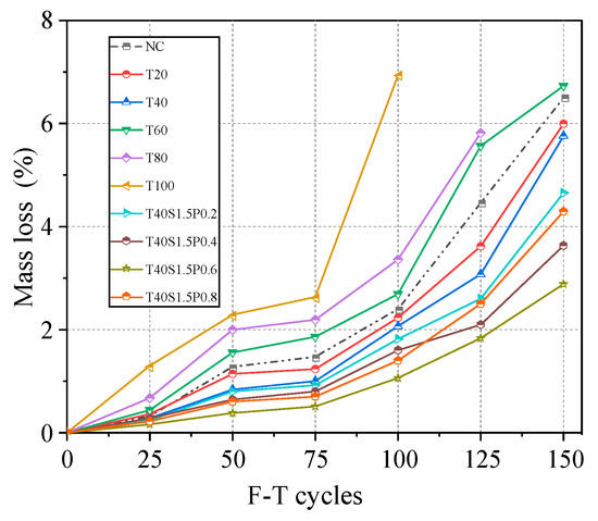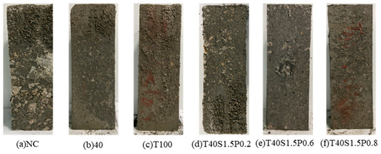 Sulfate F–T cycling is a common cause of severe deterioration in concrete engineering [62]. Surface damage for each test sample is depicted in Figure 12. The surface damage of NC is more severe, with increased exposure of NCA after 100 F–T cycles. The surfaces of T20 and T40 show mortar peeling, while damage is more pronounced on T60, T80, and T100, where NCA is visible, particularly on T100. This is primarily due to the poor distribution caused by a high substitution of RS with IOTs, accelerating the deterioration of IOT concrete. However, after the mixed addition of SF and PF, the amount of peeled-off mortar is relatively small, particularly evident in T40S1.5P0.6.