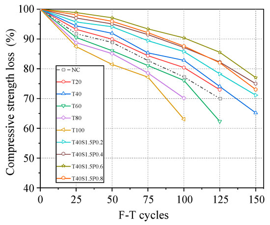 Figure 13 illustrates the fcu loss rates of concrete under various F–T cycles. These rates increase with the number of F–T cycles due to continuous F–T cycling, which promotes internal deformation and damage to the internal interfaces of concrete. The bond strength of cement mortar gradually decreases, as does that between fiber and aggregate. For instance, after 100 F–T cycles, the fcu loss rates for NC, T20, T40, T60, T80, and T100 are 22.7%, 19.6%, 17.2%, 23.9%, 29.8%, and 36.9%, respectively. Notably, the fcu loss rates of T80 and T100 exceed the 25% threshold. Following 125 F–T cycles, the fcu loss rates of T20, NC, and T60 surpass 25%, except for T40. Upon the addition of SF and PF, the fcu loss rates significantly decrease. This is attributed to an improved refinement of air voids after fiber addition, aiding in the release of expansion pressure from water freezing. However, exceeding the threshold of total volume content of hybrid SF and PF may have a negative impact due to uneven dispersion. For instance, after 150 F–T cycles, the fcu loss rates of T40S1.5-P0.4 and T40S1.5-P0.6 remain below 25%, while those of T40S1.5-P0.8 and T40S1.5-P0.2 are 27% and 28.9%, respectively.