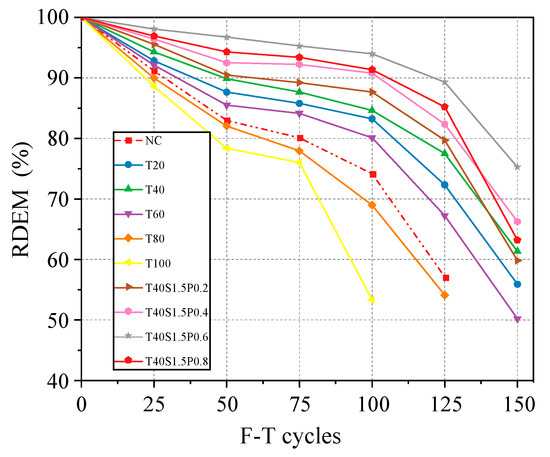 Figure 15 presents the RDEM. The RDEM of each sample shows a slight decrease (except for T100) with fewer than 100 F–T cycles but declines rapidly between 100 and 150 cycles. This decrease in RDEM is primarily associated with the formation of pores and cracks. During the initial F–T cycles, diffused SO42− reacts with cement hydration products to produce expansion products, potentially causing micro-cracks. These expansion products fill the pores, thereby reducing RDEM loss. However, as the number of F–T cycles increases, more expansion products form, accelerating deterioration and significantly reducing RDEM. Additionally, after 100 and 125 F–T cycles, the RDEM of both T100 and T80 drops below 60%. However, after 150 F–T cycles, the RDEM of T40 also falls below 60%. This indicates that a higher replacement ratio of IOTs has a negative impact on RDEM. After fiber addition, the RDEM of each concrete exceeds 60% after 150 F–T cycles. Additionally, similar to the trends observed in fcu loss and mass loss, the PF content in the hybrid fiber decreases by 0.8%, resulting in a decreasing trend in RDEM.