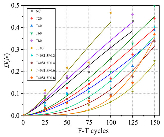 The D(N) values following different F–T cycles in the 10% Na2SO4 solution are modeled using the least squares method, as shown in Figure 16. The parameters α and β, derived from the fitting procedure, are provided in Table 5. Based on the R2 values, it is evident that the Weibull distribution function accurately predicts the D(N).