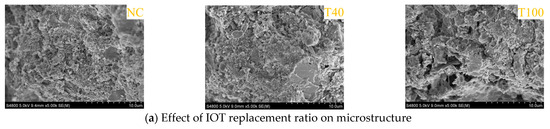 Figure 18 displays the SEM micromorphology of the concrete. In Figure 18a, it is evident that numerous pores, including connected pores and micro-pores, are large in NC, indicating a relatively loose microstructure. Comparatively, T40 exhibits significantly improved compactness throughout the matrix compared to NC. However, with a high replacement ratio of IOTs, T100 experiences an increase in the number of micro-holes, connecting holes, and cracks, leading to lower mechanical properties compared to other samples.
