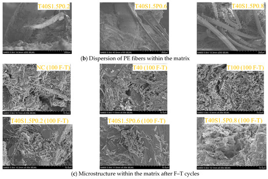 After 100 sulfate F–T cycles, Figure 18c illustrates the production of varying amounts of acicular ettringite and rod-like gypsum around the pores and cracks of concrete samples. The T40 matrix exhibits a relatively small amount of acicular ettringite compared to NC, primarily due to the improved compactness, which decreases the SO42− erosion rate. Conversely, T100 exhibits a higher abundance of acicular ettringite, suggesting increased penetration of SO42− due to more cracks and pores in the matrix, accelerating concrete sample erosion and diminishing adhesion between hydration products and aggregates. With the addition of fiber, the amount of ettringite in T40S1.5P0.2, T40S1.5P0.6, and T40S1.5P0.8 is lower than that in T40, primarily due to fiber incorporation refining the pore structure and reducing the erosion rate. However, it was found that, compared with T40S1.5P0.6, the incorporation of 0.8% PF leads to an increase in the accumulation of erosion products within the matrix due to fiber dispersion issues, while simultaneously causing a deterioration in the internal structural compactness of the matrix.