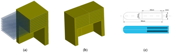 The reinforcing layer of the steel reinforcement mesh adopts a diameter of 16 mm, with a set number of layers of 8, a mesh aperture of 10 cm, and a layer spacing of 18 cm. BEAM164 elements are used for grid partitioning. To improve the computational efficiency, a separate modeling method is adopted. In this approach, the concrete main structure and the elastic layer of the steel reinforcement are modeled and divided into grids as different components; we use different unit types and materials for simulation calculation, we calculate the reinforcement unit stiffness matrix Ks and concrete unit stiffness matrix Kc separately, and then we integrate them systematically to summarize into the overall stiffness matrix K. In the separated common node model, beam or rod units are used for reinforcement; solid units are used for concrete. The common node of the reinforcement unit and the concrete unit is more consistent with the actual construction state of the building. In the calculation process, according to the stress changes during the explosion, the steel and concrete structures show different mechanical forms, so as to more accurately simulate the changes in the process of the invasion of the explosion of the various components of the material mechanics. When the concrete unit reaches the failure conditions, it is automatically deleted by the system, and the reinforcing steel unit still assumes the role of being compressive and tensile until it reaches the failure conditions, which improves the simulation accuracy of the blast intrusion process. The geometric model of the protective structure is shown in Figure 1a,b. The projectile body is made of tungsten alloy material, and the internal charge is made of TNT material. The specific dimensions are shown in Figure 1c. The SOLID164 physical element is used in the numerical modeling. The numerical calculation in this work is based on the fluid–structure coupling algorithm. Therefore, it is necessary to construct an air–fluid domain that is suitable for the overall model size. Here, the size of the fluid domain is determined to be 220 cm × 220 cm × 443 cm.