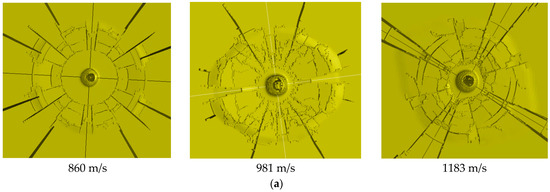 The parameter values of the P–K material model for steel bars are given in Table A2, where ρP is the density of steel, EP is the elastic modulus, Pr is the Poisson’s ratio, σy is the yield stress, ETAN is the tangent modulus, β is the hardening parameter, and SRC is strain rate parameter. The parameter values of the Johnson–Cook material model for the tungsten alloy projectile body were given in Table A3, where ρJ is the density of tungsten alloy, GJ is the shear modulus, Tm is the melt temperature, Tr is the room temperature, EPS0J is the quasi-static threshold strain rate, and AJ, BJ, NJ, CJ, and M are dimensionless parameters. The parameter values of the EOS and JWL material model for the air domain and TNT explosive were given in Table A4 and Table A5, respectively, where E0E is the initial internal energy, V0E is the initial relative volume, C0, C1, C2, C3, C4, C5, and C6 are the polynomial equation coefficient, ρJWL is the density of TNT explosive, E0JWL is the detonation energy, V0JWL is the initial relative volume, AJWL and BJWL are the constants with units, and R1, R2, and ω are the dimensionless parameters.