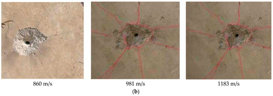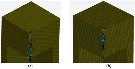 Full-scale penetration–blasting damage experiments are very expensive. Most of the current numerical research methods are based on the finite element method, in addition to the finite difference method [19] and the emerging Bessel-based robust multistep method [20]. Among them, the finite difference method divides the solution region into a difference grid, replacing the continuous solution domain with a finite number of grid nodes. The finite difference method discretizes the derivatives in the governing equations by replacing them with the difference quotients of the function values at the grid nodes by methods such as Taylor series expansions, thus creating a system of algebraic equations with the values at the grid nodes as unknowns, which is adapted to the problems with linear region rules. Bessel’s robust multistep method is a meshless technical method combining the Gaussian quadrature technique with the Bessel-based multistep method, which can be used for the stress analysis of notched composite plates due to the fact that fracture occurs during the numerical simulation of intrusive, as well as explosive cases, and Bessel’s robust multistep method is very robust in a stress–strain analysis of composites which are subjected to cracking. Therefore, a numerical simulation was generally used to evaluate the damaging effect of EPWs on actual underground protective structures. Previous numerical studies mostly used the restart method to analyze the blasting damage effect after the completion of EPW penetration [21,22]. However, this method cannot consider the initial damage caused by the projectile body to the protective structure during the penetration stage. Due to the complexity of the damage process, there is a superposition effect between the wavelengths of the penetration and blasting action [23]; some studies also indicated that the projectile fragments have an impact on the range of the subsequent explosive damage [24]; these effects are difficult to consider in the restart model. The characteristics of the dynamic explosive shock wave of the moving charge [23] has confirmed that there are interactions between media in complex penetration–blasting damage processes. Sun et al. [25] compared the damage effects of pre-drilled explosive charges and post-penetration–blasting. The results indicated that the fragmentation and simple superposition of the two processes cannot truly reflect the destructive effect of EPWs on the protective structure, and this simplification is detrimental to the damage assessment of protective structures. Yang et al. [26] reported that the penetration of EPWs has an undeniable enhancing effect on the subsequent blasting damage of concrete targets.
