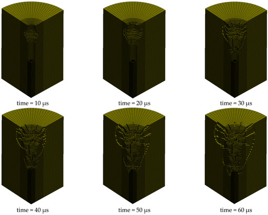 The numerical simulation of the damage process inside the target during the internal explosion experiment of prefabricated holes in concrete is shown in Figure 4. The overall damage effects obtained by the numerical model and the experiment are compared in Figure 5a,b. It can be seen that the damage morphology of the two is very similar. The numerical model forms a funnel pit area at the top, similar to the experimental results, with a large number of fine cracks spreading from the center of the hole to the edge of the specimen and five main cracks with larger widths generated at the top. The simulation result of the crater depth in the numerical model is shown in Figure 5c, with an explosion crater depth of approximately 53 mm. The experimental measurement result is 48.5 mm, and the relative error can be calculated as 9.3%. These comparisons demonstrate the credibility of the numerical modeling method used in this article.