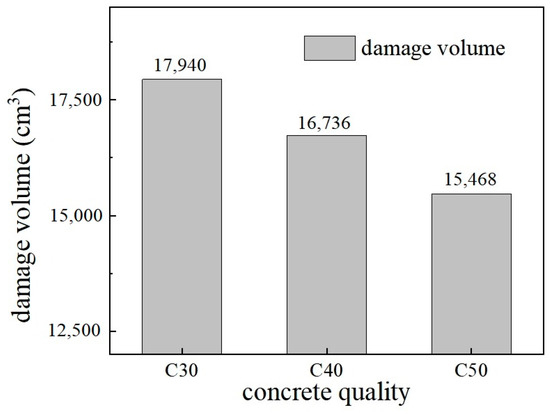 For plain concrete barriers, the quality of the concrete is an important factor in the resistance of the barrier to damage. Figure 7 shows the damage volume of C30, C40, and C50 plain concrete barriers when subjected to internal blast damage. It can be seen that, as the quality of the concrete improves, the ability of the protective layer to resist the internal explosion also increases.