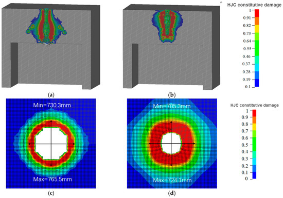 Figure 8 shows the penetration depth of the projectile under Cases 1 and 2, while Figure 9a,b provide three-dimensional damage images under Cases 1 and 2. From the figures, it is evident that, for protective structures of the same thickness, the protective ability has significantly improved after the addition of a steel reinforcement layer. There are also notable differences in damage morphology between the two cases. The EPW detonates deeper in the position of the plain concrete protective structure, with its damage primarily concentrated in the middle and lower parts (the protective layer has fully penetrated, and the damage volume is 16,736 cm3). In contrast, the protective structure equipped with steel reinforcement mesh allows the projectile to stay inside the protective layer, resulting in damage concentrated in the upper and middle parts (with a penetration depth of 1.15 m and a damage volume of 8640 cm3). During the blasting process, larger voids appeared in the plain concrete structure at the explosion point, forming a shuttle shape. The damage to the composite structure at the explosion point did not significantly expand, and the overall stress distribution was more uniform. Figure 9c,d show the top-view clouds of Case 1 and Case 2. As shown in the Figures, the maximum diameter of the damaged area is 765.2 mm when the steel reinforcement layer is not set, while, after setting up eight layers of steel reinforcement mesh, the maximum diameter of the damaged area is 724.1 mm. This indicates that the steel reinforcement layer also has a limiting effect on the blasting damage, providing better protection for internal personnel and equipment.
