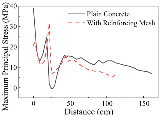Figure 10 shows the stress distribution on the upper surface of the internal use area of the protective structure during the explosion of the projectile. The abscissa represents the distance from the measuring point to the center point (i.e., the path from measuring points S1 to S4). As shown in the Figure, due to the projectile penetrating the entire protective layer of plain concrete, the maximum principal stress reaches its maximum value in the penetration zone. Near the penetration point (within 50 cm), the stress in Case 1 is much greater than that in Case 2. When away from the target point, the stress of both is almost equal. This indicates that the set steel reinforcement mesh plays an important role in limiting the blasting damage effect of the projectile at the penetration point of the protective structure.