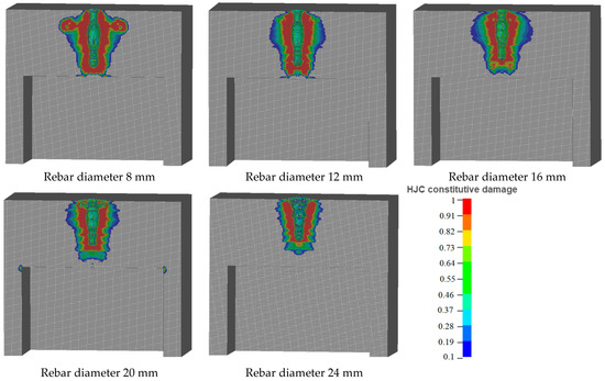 In this study, we compared and examined the numerical results of the penetration–blasting effects for composite protective structures with steel bar diameters of 8 mm, 12 mm, 16 mm, 20 mm, and 24 mm, respectively. The relevant parameters are detailed in Cases 2, 3, 4, 5, and 6 in Table 2. The three-dimensional damage images of each case are presented in Figure 11, and the damage information is summarized in Figure 12. Observations from Figure 11 and Figure 12a reveal that, as the diameter of the steel bar increases, the location of the explosion gradually approaches the top of the protective layer, and the damage caused by the explosion is concentrated at its top. Figure 12b indicates that the holes resulting from projectile penetration and blasting damage increase with the increase in steel bar diameter. According to the literature [35], this phenomenon is attributed to the dynamic explosion effect of high-speed projectiles having similar properties in concrete and air media. The intensity of the explosion wave field in the same direction as the velocity is positively correlated with the velocity, while the intensity of the wavelength in the opposite direction is negatively correlated with the velocity. Due to the rapid consumption of kinetic energy by the steel reinforcement mesh, the velocity of the projectile decreases, leading to significant damage to the top of the protective structure. This further expands the penetrating hole, resulting in an increase in damage volume. Consequently, the explosion location is closer to the top penetration hole. The impact energy generated by the explosion acts more on the upper part of the protective layer and in the air, forming larger funnel-shaped deep pits on the outer surface. Figure 12c illustrates that, as the diameter of the configured steel bars increases, the maximum damaged area and volume of the protective structure show a trend of first decreasing, then increasing, and finally increasing. This complex behavior is attributed to the dual effects of the penetration depth and the diameter of the hole generated by blasting on the damaged volume.