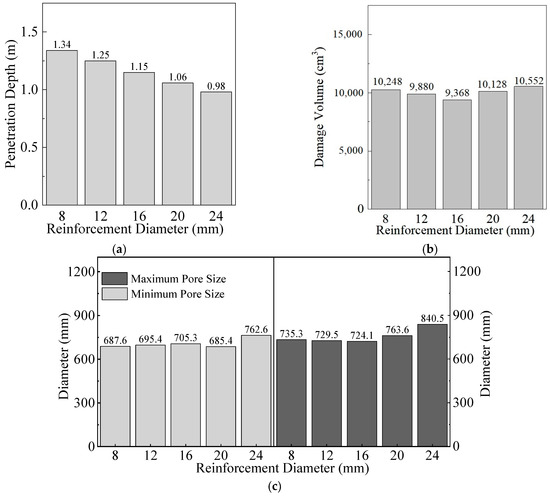 Damage information of protective structures with different diameters of steel bars: (a) penetration depth; (b) damage volume; and (c) diameter of damage hole formed by EPW.