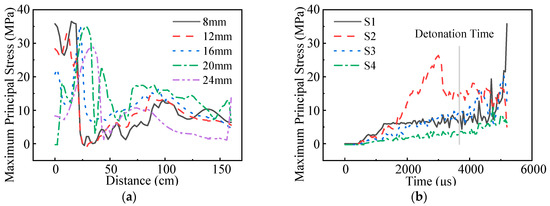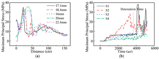 To comprehensively evaluate the impact of different reinforcement configuration schemes on the structural protection effect, it is also necessary to discuss the stress distribution and evolution on the surface of the internal use area, as shown in Figure 18. Due to the collapse at the center of the protective layer in Cases 11, 12, and 14, the maximum principal stress at the starting position of the corresponding stress curve is zero. It can be found that, as the diameter of the steel reinforcement mesh increases and the number of layers decreases, the peak value of the maximum principal stress decreases. Moreover, the position where the peak occurs gradually deviates from the center and moves towards the supporting wall. When away from the center, as the number of steel layers decreases, the amplitude of stress change increases, but the peak value does not differ much. The maximum principal stress peak at S1 is close to 40 MPa (except for Case 13); the number of measuring points reaching 30 MPa at S2 increases as the number of steel reinforcement mesh layers decreases. For S3 and S4 near the supporting wall, the stress curves of the five cases are basically the same. The above results show that Case 13 has the best resistance to penetration–blasting damage. This indicates that, under the same reinforcement ratio, changing the number of steel reinforcement mesh layers and the steel diameter within a certain range can improve the performance of the protective structure. In actual reinforcement design, one can consider selecting the configuration scheme with the highest cost-effectiveness after determining the reinforcement ratio. Moreover, the setting of the steel reinforcement mesh should be moved up to ensure that blasting damage occurs in the upper layer of the protective structure.