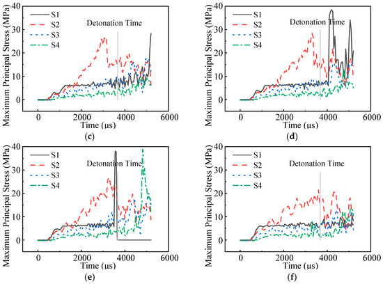 Protective structures with the same reinforcement ratio: (a) maximum principal stress distribution after penetration–blasting damage; evolution of maximum principal stress at each measuring point versus time for steel reinforcement with (b) diameter of 16 mm, 8 layers; (c) diameter of 17.1 mm, 7 layers; (d) diameter of 18.5 mm, 6 layers; (e) diameter of 20.2 mm, 5 layers; and (f) diameter of 22.6 mm, 4 layers.