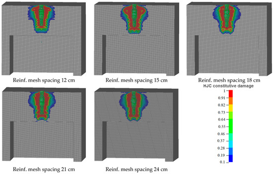 The numerical investigation of the penetration–blasting damage on protective structures with a steel reinforcement mesh spacing of 12 cm, 15 cm, 18 cm, 21 cm, and 24 cm was conducted. The relevant parameters are outlined in Cases 2, 7, 8, 9, and 10 in Table 3. The three-dimensional damage images of each case are presented in Figure 14, and the damage information is summarized in Table 3. An analysis of Figure 14 and Table 3 reveals a positive correlation between the penetration depth of the projectile and the spacing of the steel reinforcement mesh. The location of the damage caused by blasting tends to move towards the deeper layers of protective structures as the spacing between te steel reinforcement mesh increases. When the spacing value is reduced from 24 cm to 12 cm, the number of layers of steel reinforcement mesh penetrated by the projectile increases from 5 to 8, and the penetration depth decreases from 1.2 m to 1.08 m. This suggests that increasing the number of layers of steel reinforcement mesh effectively consumes the penetration kinetic energy of the projectile, enhancing the anti-penetration performance of the protective structure. However, the change in spacing between the steel reinforcement mesh does not exhibit a regular effect on the diameter of the penetration–blasting damage holes and the total damage volume. This complexity is attributed to the fact that a deeper penetration depth limits the damage caused by blasting, reflecting the intricate impact of the steel reinforcement mesh on the penetration–blasting damage.
