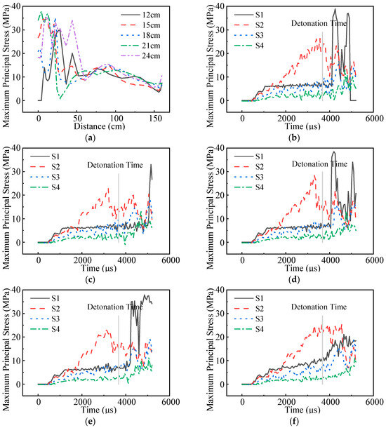 (a) Maximum principal stress distribution of the protective structure after penetration–blasting damage; and evolution of maximum principal stress at each measuring point versus time with reinforcement mesh spacing of (b) 12 cm, (c) 15 cm, (d) 18 cm, (e) 21 cm, and (f) 24 cm.