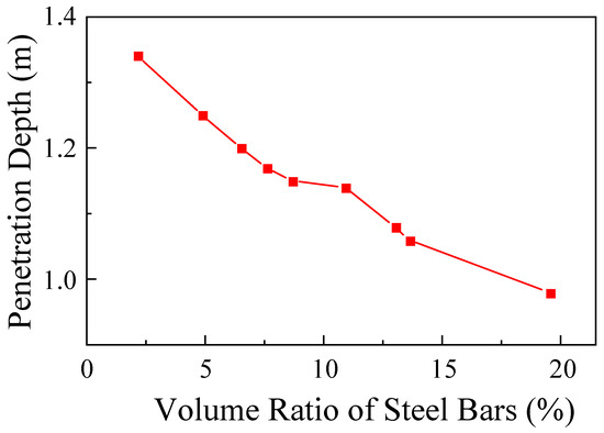 Relationship curve between the proportion of steel reinforcement volume and penetration depth.