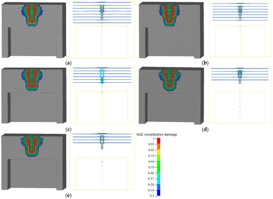 Concrete damage and steel layer penetration effect of protective structures under the same reinforcement ratio for steel rebar with (a) diameter of 16 mm, 8 layers; (b) diameter of 17.1 mm, 7 layers; (c) diameter of 18.5 mm, 6 layers; (d) diameter of 20.2 mm, 5 layers; and (e) diameter of 22.6 mm, 4 layers.
