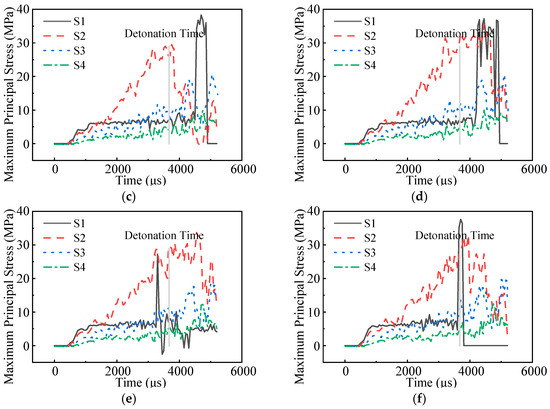 Figure 15 illustrates the maximum principal stress distribution on the upper surface of the internal use area of the protective structure after blasting damage, along with the evolution curve of the maximum principal stress at each measuring point over time. In Case 2, concrete collapse occurred at the center of the protective layer, resulting in a maximum principal stress of zero at the origin of the corresponding curve in Figure 15a. For the remaining cases, within the range of 50 cm from the bottom center of the protective layer, the stress curve corresponding to Case 10 is lower than the other three cases. The stress peaks achieved by the four cases are relatively close. As the measuring point gradually moves away from the center position, the trend and value of the maximum principal stress curve under various cases also gradually approach it. Figure 15b–f demonstrate that the changes in the time history curves of stress in Case 2 and Cases 7, 8, and 9 are consistent at S1 and its adjacent S2. However, when the spacing increases to 24 cm (Case 10), the number of points where the curve corresponding to S2 reaches its maximum value is the greatest. This indicates that increasing the number of layers of steel bars results in a more uniform stress distribution throughout the protective structure. It can be seen that densifying the steel reinforcement mesh can improve the anti-penetration and blasting damage performance of the protective structure. However, when the change in spacing is within a certain range, the effect on the structure’s resistance to blasting damage is not significant.
