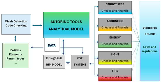 Nevertheless, the interoperability is rarely perfect, and information is lost during translation from the BIM authoring tool to the simulation software [50]. The discrepancies in data translations from the BIM authoring tool to specific calculation virtual environments (CVE) for structural, energy, and acoustic evaluation must be considered. The architectural model is converted into an analytical model in order to perform different types of assessments in CVE [51], defining the interoperability paths from BIM to CVE for structural, energy, and acoustic evaluations [52,53].