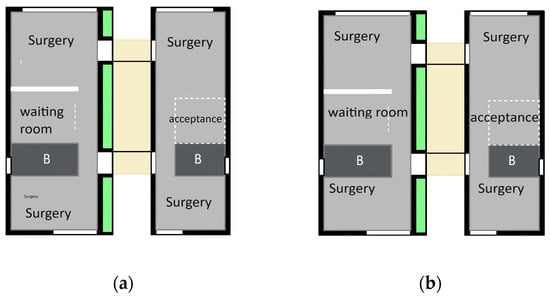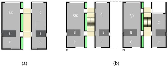 Redistribution of modular units to accommodate an increasing number of people. Four to six people (a) and eight to ten people across two floors, PT and P1 (b). Bathrooms are located in the dark grey areas (B), bedrooms (c) and living rooms with kitchen (s/k) are coloured light grey.