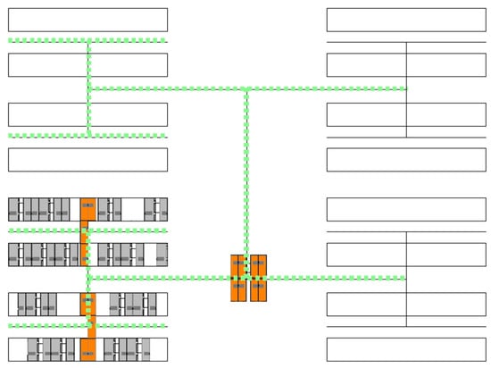 As the quantity of modules increases, in particular when 20 residential modules are present, the development project envisages the partial replacement of the individual energy units with a single energy house and a relatively common distribution network for the production of thermal energy for climate control (Figure 6). In this case, the sharing of mixed networks (WiFi and/or wired) is necessary for the centralised management of the main service systems associated with the users (climate control, security and surveillance, and the development of support networks for emergencies and rescue).