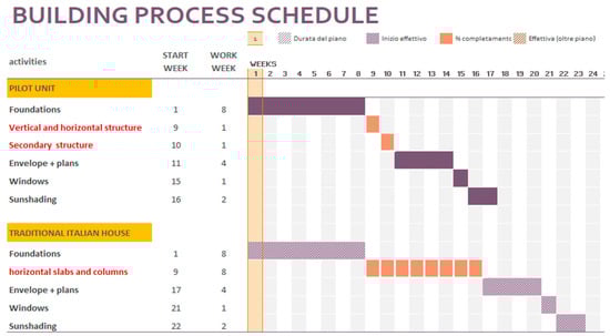 The number of people involved in achieving the completed structure with horizontal slabs so that it was comparable with steps 2 to 5 of the pilot unit was estimated to be equal to six per day, including the scaffolding assembly and disassembly, which were not necessary for the pilot unit. The construction site vehicles were comparable with those of the modular system.