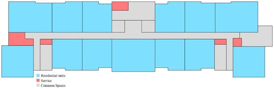 - For each building, the area of unoccupied spaces is calculated and subtracted from the gross area.
