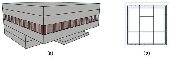 The building model utilized in this study is a simplified adaptation of the Shenzhen University Library and serves as a representative example of the common academic library architecture in China. The structure comprises six floors, with each floor having a 4 m ceiling height and a floor area of 2500 square meters. To balance model complexity and computational efficiency, the analysis is concentrated on a single, standard floor within the building. This simplification reduces the computational time while maintaining useful accuracy for multi-objective optimization studies []. The standard floor consists of seven zones, each with the same function (primarily seating and reading spaces). Figure 1 shows the floor plan and the simulation model of the studied library.