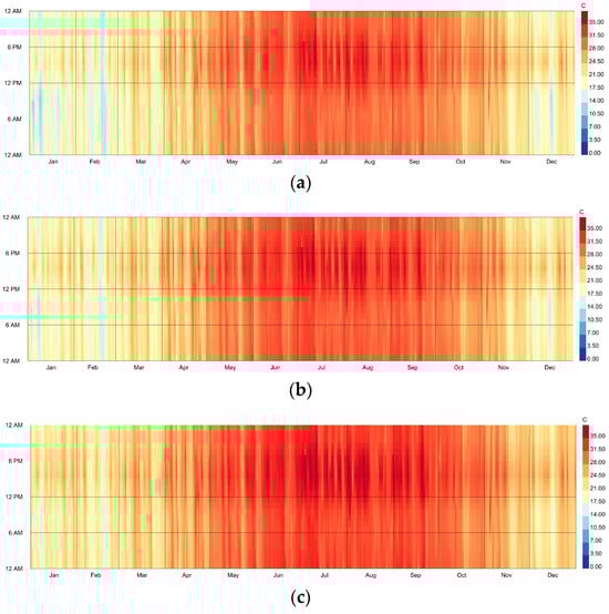 Dry bulb temperature for three weather scenarios: (a) year 2020; (b) year 2050; (c) year 2080.