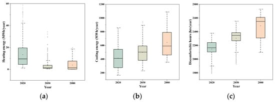 Figure 3 presents a comparison of the building energy and comfort metrics under the three weather scenarios. The analysis of the box plots for heating energy, cooling energy, and discomfort hours across different years reveals significant insights into the impact of climate change on the building’s energy consumption and occupant comfort. The box plots summarize the results of all 2000 run simulations, highlighting the range and distribution of the outcomes. A discernible trend towards increased cooling energy consumption and discomfort hours, likely due to rising temperatures, underscores the need for climate-responsive building designs and efficient cooling systems. Conversely, the variability in heating energy consumption suggests changing heating requirements, highlighting the importance of adaptable heating solutions. These trends collectively emphasize the critical need for sustainable and resilient architectural practices that prioritize both energy efficiency and occupant comfort in response to evolving climatic conditions.