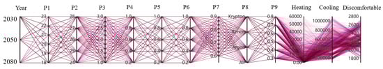 Figure 4 introduces a parallel coordinate plot (PCP) that illustrates the interrelationships between the different joint configurations in this study. This figure effectively displays the multi-dimensional nature of the dataset, allowing for an examination of how various building parameters interact and influence each other []. Each line in the PCP represents a specific joint configuration, while the axes correspond to the different building parameters used in the optimization process. By plotting the data in this manner, it becomes easier to identify patterns and correlations between parameters, as well as to understand the trade-offs involved in the multi-objective optimization. In addition, Figure 5 showcases the three-dimensional Pareto fronts resulting from the Non-Dominated Sorting Genetic Algorithm II (NSGA-II) optimization process, applied across the three distinct weather scenarios. The “best solutions” demarcated in the figure are those that have achieved a Pareto-optimal status, where no other solution is superior in all three objectives simultaneously. These solutions occupy a region of the Pareto front that balances lower energy use with minimized discomfort hours, indicative of optimized building performance. The spread of the solutions along the Pareto front underscores the variability in the performance trade-offs that can be achieved through architectural and control strategy modifications. The density of points near the “best solutions” region suggests that while many configurations can reduce the energy consumption and discomfort hours, only a few do so optimally.