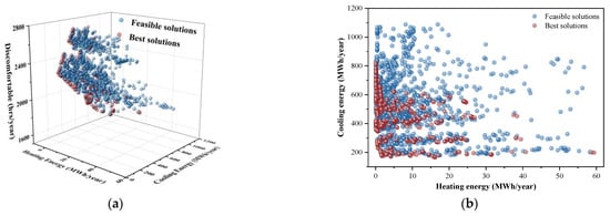 This adjusted weighting strategy guarantees an equal emphasis on energy consumption (encompassing both heating and cooling energy) and the comfort level (quantified as discomfort hours) in the evaluation of the solutions. This methodological approach ensures a holistic assessment, balancing the imperatives of energy efficiency and occupant comfort. By considering both energy and comfort metrics comprehensively, this approach provides a more integrated view of building performance. Consequently, solutions exhibiting the lowest weighted sum scores are identified as the optimal choices for each specific weather scenario—2020, 2050, and 2080. The detailed outcomes of this analysis are presented in Table 6, where the best solutions under each weather scenario are systematically tabulated, elucidating their efficacy in meeting the stipulated objectives.