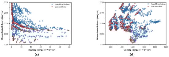 Optimal solutions and three-view projections of the Pareto front: (a) 3D View of feasible and best Solutions; (b) Cooling Energy vs. Heating Energy; (c) Discomfortable Hours vs. Heating Energy; (d) Discomfortable Hours vs. Cooling Energy.