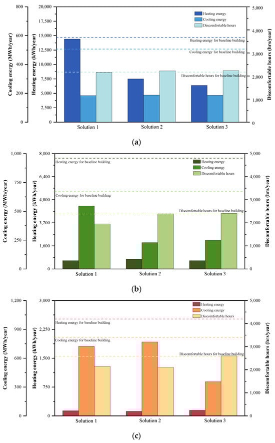 Comparison of top three optimization solutions for each weather scenario (refer to Table 6) with baseline building: (a) year 2020; (b) year 2050; (c) year 2080.