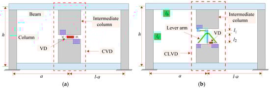 Traditional intermediate column viscous damper (CVD) and intermediate column–lever viscous damper (CLVD): (a) CVD; (b) CLVD.