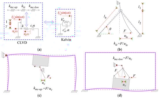 The vibration reduction effect of the energy dissipation structure originates from the stiffness and damping effects that are added by the relevant damping system. The Kelvin mechanical model directly adds stiffness and damping to the structure. In order to facilitate the analysis of the vibration reduction effect of the CLVD damping structures, it is necessary to transform the simplified mechanical model of the CLVD into a Kelvin mechanical model. In the Kelvin model, the damping coefficient is , the damping index is , and the spring stiffness is , as shown in Figure 4a.