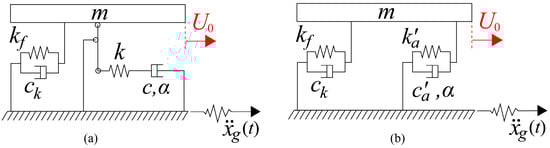 The principle of setting a damper to reduce the seismic response of a structure is based on the effect achieved by increasing the damping due to both the energy dissipation of the damper and the stiffness effect of decreasing the period of the structure due to the additional stiffness. The damping effect enables the structure’s displacement and shear force to decrease simultaneously, and the stiffness effect makes the displacement decrease and the shear force increase. According to the discussion in Section 2.2 and Section 2.3, the single-layer structure with a CLVD is illustrated in Figure 1b, the simplified mechanical model is shown in Figure 5a, and the equivalent Kelvin mechanical model is revealed in Figure 5b. According to the Chinese Code [], the total damping of the damping structure can be obtained as follows: