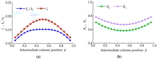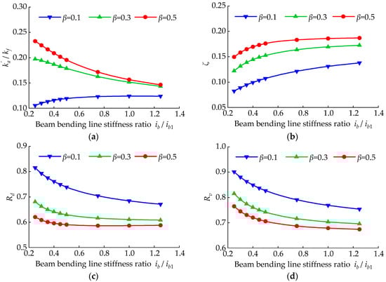 This section explores the impact of changing the beam’s bending line stiffness on and . In Figure 7, represents the beam’s bending line stiffness with a cross-section of . When the intermediate column is located in different positions, the impact of the change in on and is different. As illustrated in Figure 7a, when the intermediate column is located at the end of the span, the stiffness provided by the CLVD to the structure increases with the increase in .