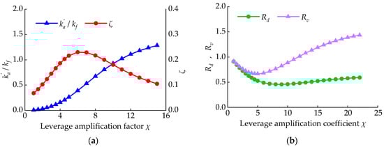 This section explores the impact of changing the leverage amplification factor on and . In Figure 8a, it can be seen that with the increase in the leverage amplification factor , increases, and first increases and then decreases. Therefore, an optimal leverage amplification factor exists that maximizes the total damping ratio of the structure. In Figure 8b, with the increase in , and are shown to first decrease and then increase. When the leverage amplification factor is too large, the CLVD provides the structure with stiffness as the main factor, followed by damping. This enables the CLVD to have an improved displacement control effect on the structure, while it has a worse control effect on the shear force.