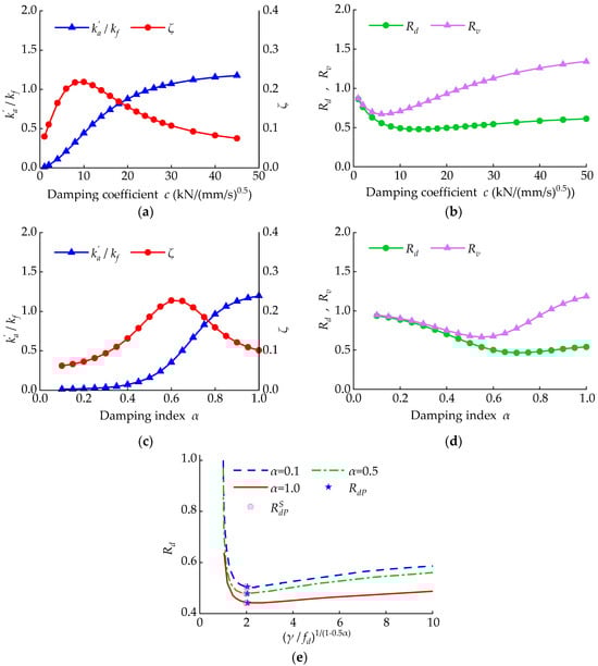 In Figure 10e, . In Figure 10e, when the earthquake intensity is large, it is shown that an increase in the damping coefficient can significantly reduce . However, when the earthquake intensity is low, increasing the damping coefficient will result in an increase in and .