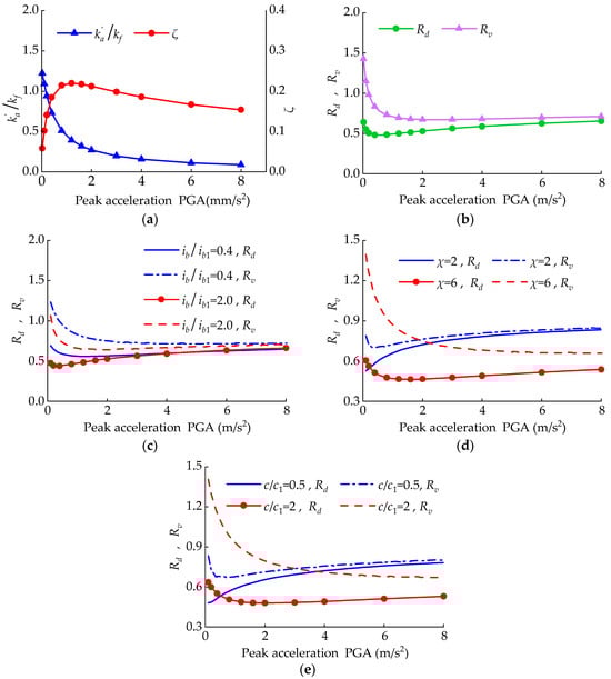 Changes in , , , and with PGA: (a) changes in and with the PGA; (b) changes in and with the PGA; (c) changes in and with the PGA and ; (d) changes in and with the PGA and ; (e) changes in and with PGA and .
