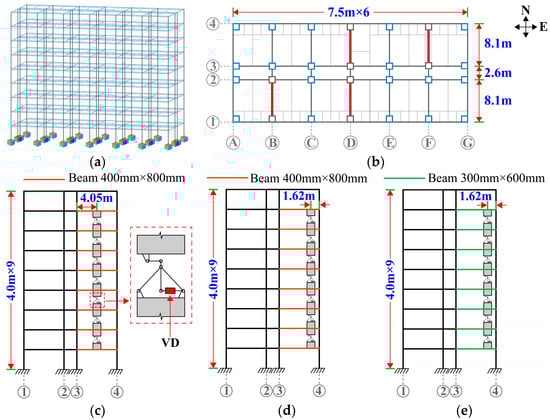 Three-dimensional schematic diagram of the structure and layout of dampers in different schemes: (a) a 3D schematic diagram of the structure; (b) the layout of CLVD; (c) Scheme 1 (F-axis); (d) Scheme 2 (F-axis); (e) Scheme 3 (F-axis).