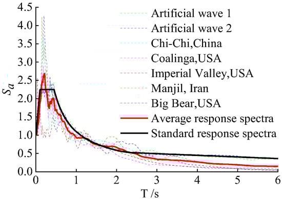 The elastic section design of the additional CLVD structure is based on the response spectrum design under fortification earthquakes according to the Chinese Code []. In the response spectrum design, the effect of CLVDs on the structure is replaced by the equivalent damping ratio and the equivalent stiffness of Scheme 1. The seismic elastic dynamic analysis is conducted utilizing SAP2000 software (version 23.3.0), while the elastic–plastic dynamic analysis for rare earthquakes is conducted utilizing Perform-3d software (version 7.0). In the elastic–plastic analysis, fiber section models are adopted for beam and column components, and the steel reinforcement adopts a double-line model; the unconstrained concrete adopts a three-line model; and the constrained concrete adopts the Mander model. The viscous damper adopts a fluid damper element. In the parameter analysis of the vibration reduction efficient of the CLVD in Section 3.2, it is assumed that the structure without a CLVD maintains elasticity. Therefore, the structure without an additional CLVD is forced to maintain elasticity. Subsequently, the dynamic calculations of rare earthquakes are performed. This can avoid the plastic deformation of the structure without a CLVD, which increases the complexity of the vibration reduction effect analysis. According to the Chinese Code [], five natural waves and two artificial waves are selected. A comparison between the normalized spectrum of the selected seismic wave and the normalized standard response spectrum is shown in Figure 12. All analysis results in this section are taken as the average of seven seismic wave calculation results. Due to space limitations, this section only elaborates on the application of CLVD damping systems in the north–south direction of structures.