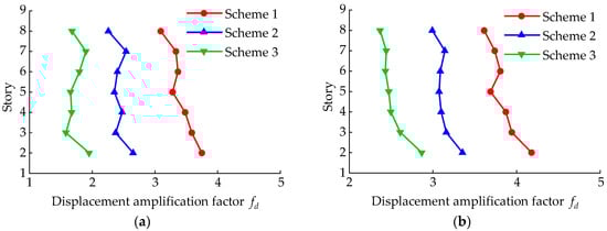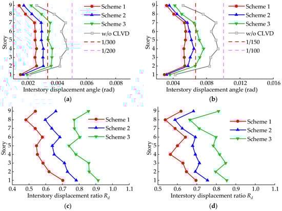 Table 2 summarizes the damping ratios, which are added to structures under different damper schemes. The calculation of the additional damping ratio is based on the traditional specification method in []. ζd = Wc/(4πWs). ζd is the additional damping ratio, Wc is the total energy dissipation of the damper, and Ws is the total potential energy of the structure. According to Table 2, under fortification earthquakes, the additional damping ratios from Scheme 1 to Scheme 3 are 12.1%, 7.1%, and 4.4%, respectively. Scheme 1 also meets the expected additional damping ratio of 10%.
