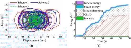 Figure 14a illustrates the hysteresis curves of the damper at position F-(3-4) on the fifth floor under the Big Bear wave in different schemes. In Figure 14a, due to the good displacement amplification ability of the CLVD in Scheme 1, it is illustrated that the hysteresis curve of its damper is also increased in size. In Figure 14b, under rare earthquakes, the CLVD energy dissipation of Scheme 1 is significantly greater than the inherent damping energy dissipation of the structure, which suppresses the plastic deformation of the structure.