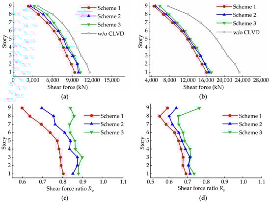 The control effects of the CLVD damping system for the inter-story displacement and floor shear force from Schemes 1 to Scheme 3 are illustrated in Figure 15 and Figure 16. According to Figure 15, Scheme 1 has a maximum inter-story displacement angle of less than 1/300 under fortification earthquakes and less than 1/150 under rare earthquakes. For all the floors except for the first floor, the inter-story displacement of Scheme 1 has been reduced by almost 40% under fortification earthquakes and by almost 30% under rare earthquakes. In comparison with Scheme 1, Scheme 2 and Scheme 3 have worse effects. The story shear forces of Scheme 1 are reduced to a certain extent, while the reduction is smaller than the reduction in inter-story displacement. This is because the CLVD adds both damping and stiffness to the structure. For Scheme 2 and Scheme 3, the reduction in the story shear forces is greater than the reduction in inter-story drift. This is because the structures with CLVDs in Schemes 2 and Schemes 3 undergo significant plastic deformation during rare earthquakes, while the structure without CLVDs is forced to maintain its elasticity.