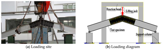 The equipment for the test loading was basically consistent with the joint test [22], as shown in Figure 3a. The load structure mainly comprised a boundary frame, hinge support, lifting jack, as well as data acquisition and loading control instruments. In the experimental process, the two specimen ends were tightly connected to the hinged support first. Subsequently, as displayed in Figure 3b, the specimen center was imposed with a vertical concentrated force via a jack. With the utilization of the above-mentioned loading approaches and support forms, the boundary condition simulation under vertical load was possible for the AAPF beam joints, so that the effectiveness of test outcomes could be guaranteed. Over the course of the experiment, the loading speed was regulated by the loading control instrument. In this test, the speed of loading was 1 mm/min.